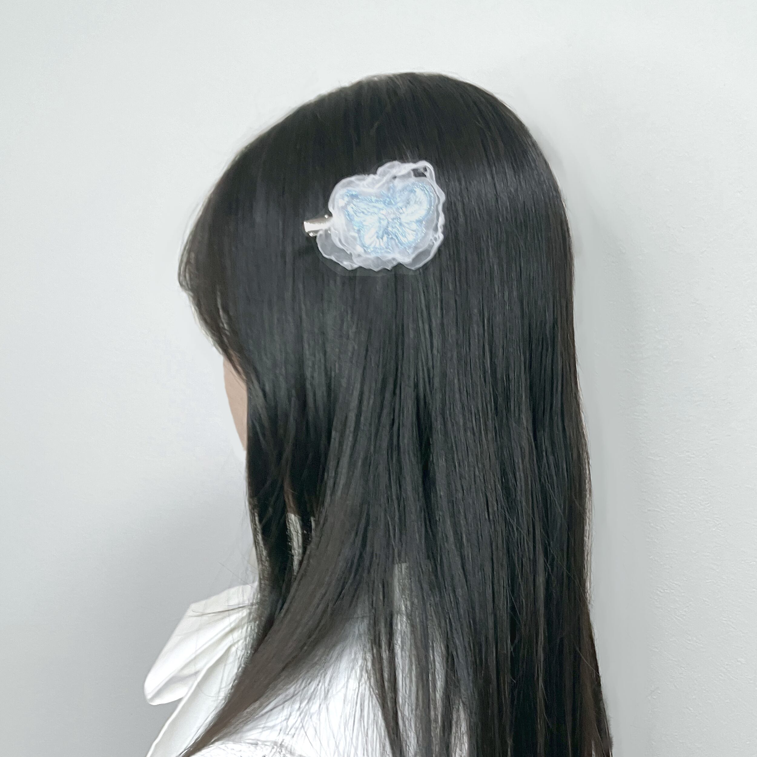 髪に蝶がそっと触れたみたいなヘアクリップ。